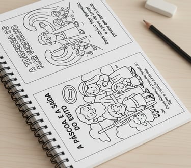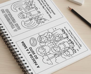 Pensado para quem deseja praticidade e economia, este formato traz duas ilustrações por página. Assim, você imprime gastando menos papel, continua aproveitando todo o conteúdo e garante ainda mais momentos de aprendizado e diversão com a Palavra de Deus.